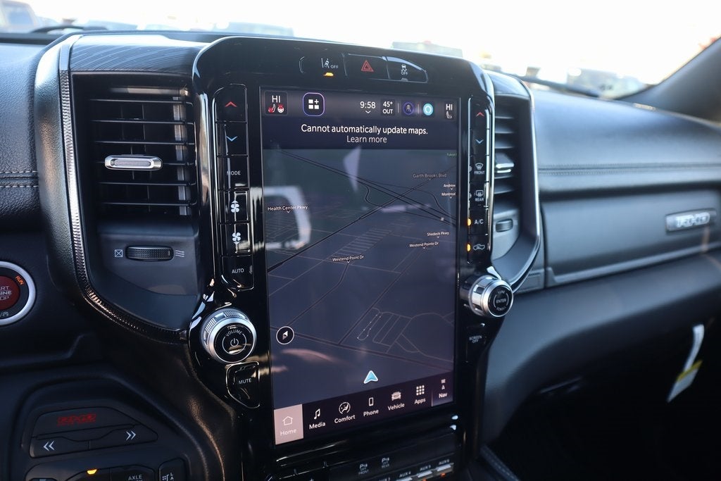 THIS VEHICLE COMES EQUIPPED WITH THE FOLLOWING OPTIONS AND FEATURES: Bed Utility Group (Exterior 115V AC Outlet, MOPAR 4 Adjustable Cargo Tie-Down Hooks, and MOPAR Deployable Bed Step), Quick Order Package 22Y RHO, 10 Speakers, 3.92 Rear Axle Ratio, 4-Wheel Disc Brakes, 4G LTE Wi-Fi Hot Spot, ABS brakes, Adaptive suspension, Adjustable pedals, Air Conditioning, Alloy wheels, AM/FM radio, Apple CarPlay/Android Auto, Auto High-beam Headlights, Auto Power-Folding Mirrors, Auto-dimming door mirrors, Auto-Dimming Exterior Driver Mirror, Auto-dimming Rear-View mirror, Automatic temperature control, Brake assist, Compass, Connected Travel and Traffic Services, Connectivity - US/Canada, Delay-off headlights, Disassociated Touchscreen Display, Driver door bin, Driver vanity mirror, Dual front impact airbags, Dual front side impact airbags, Electronic Stability Control, Exterior Mirrors Courtesy Lamps, Exterior Mirrors with Heating Element, Exterior Mirrors with Supplemental Signals, Exterior Parking Camera Rear, Flareside Box, Front anti-roll bar, Front Bucket Seats, Front Center Armrest w/Storage, Front dual zone A/C, Front fog lights, Front reading lights, Front wheel independent suspension, Fully automatic headlights, Garage door transmitter, GPS Navigation, HD Radio, Heated door mirrors, Heated front seats, Heated steering wheel, Illuminated entry, Integrated Center Stack Radio, Integrated Voice Command with Bluetooth®, Leather Shift Knob, Leather steering wheel, Leather Trimmed Bucket Seats, Low tire pres