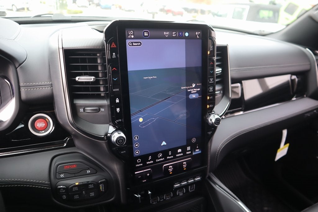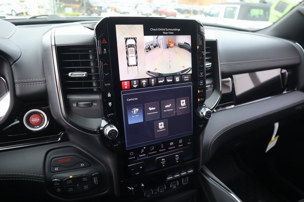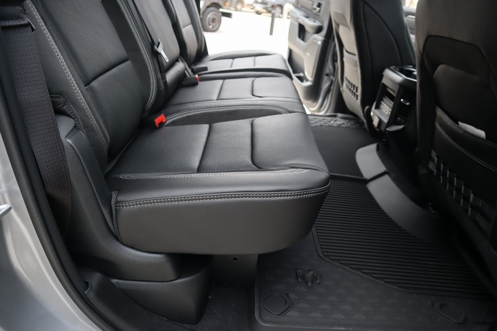 THIS VEHICLE COMES EQUIPPED WITH THE FOLLOWING OPTIONS AND FEATURES: Bed Utility Group (Exterior 115V AC Outlet, MOPAR 4 Adjustable Cargo Tie-Down Hooks, and MOPAR Deployable Bed Step), Quick Order Package 22Y RHO, RHO Level 1 Equipment Group (12-Way/1-Way Trailer Connector, 14.4 Touchscreen Display, 240 Amp Alternator, 4G LTE Wi-Fi Hot Spot, Connectivity - US/Canada, Disassociated Touchscreen Display, Driver Power Seat Back Massage, Driver Seat Memory, Driver/Passenger Wrapped Assist Handles, Drowsy Driver Detection, Dual Wireless Charging Pad, Evasive Steer Assist, Front Passenger Interactive Display, Front Passenger Power Seat Back Massage, Full Length Premium Upgraded Floor Console, GPS Navigation, Hands-Free Active Driving Assist System, HD Radio, Heads-Up Display, Heated Second Row Seats, Integrated Center Stack Radio, Intersection Collision Assist System, Leather/Carbon Flat-Bottom Steering Wheel, LED CHMSL Lamp, Luxury Front Door Trim Panel, Power Tailgate, Radio/Driver Seat/Mirrors/Pedals Memory, Rain Sensitive Windshield Wipers, Real Carbon Fiber Interior Accents, Rear 60/40 Folding Split Recline Seat, SiriusXM Radio Service, Surround View Camera System, Traffic Sign Recognition, USB Host Flip, Ventilated Front Seats, and Ventilated Rear Seats), 10 Speakers, 3.92 Rear Axle Ratio, 4-Wheel Disc Brakes, ABS brakes, Adaptive suspension, Adjustable pedals, Air Conditioning, Alloy wheels, AM/FM radio, Apple CarPlay/Android Auto, Auto High-beam Headlights, Auto Power-Folding Mirrors, Auto-dimming door mirrors, Auto-Dimming Exterior Driver Mirror, Auto-dimming Rear-View mirror, Automatic temperature control, Brake assist, Compass, Delay-off headlights, Dome Dual LED Reading Lamp, Driver door bin, Driver vanity mirror, Dual front impact airbags, Dual front side impact airbags, Dual-Pane Panoramic Sunroof, Electronic Stability Control, Exterior Mirrors Courtesy Lamps, Exterior Parking Camera Rear, Flareside Box, Front anti-roll bar, Front Bucket Seats, Front Center Armrest w/Storage, Front dual zone A/C, Front fog lights, Front reading lights, Front wheel independent suspension, Fully automatic headlights, Garage door transmitter, Heated door mirrors, Heated front seats, Heated steering wheel, Illuminated entry, Leather Shift Knob, Leather steering wheel, Leather Trimmed Bucket Seats, Low tire pressure warning, MOPAR RHO Exterior Graphics, Navigation System, Occupant sensing airbag, Outside temperature display, Overhead airbag, Overhead console, Panic alarm, Passenger door bin, Passenger vanity mirror, Power door mirrors, Power driver seat, Power passenger seat, Power steering, Power windows, Radio data system, Rear reading lights, Rear seat center armrest, Rear step bumper, Rear window defroster, Remote keyless entry, Security system, Speed control, Split folding rear seat, Sport steering wheel, Steering wheel mounted audio controls, Tachometer, Telescoping steering wheel, Tilt steering wheel, Traction control, Trip computer, Turn signal indicator mirrors, Variably intermittent wipers, Voltmeter, and Wheels: 18 x 9 Black Paint/Polish Aluminum.