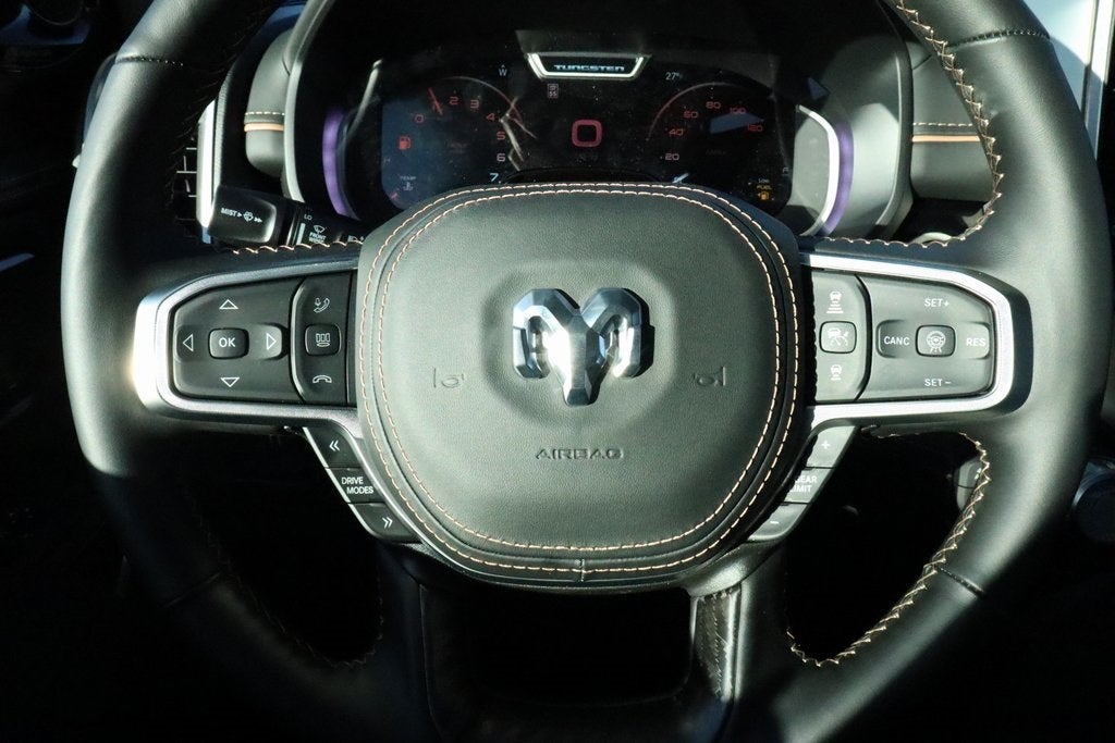 2026 Ram 1500 Bed Utility Group (Exterior 115V AC Outlet, MOPAR 4 Adjustable Cargo Tie-Down Hooks, and Truck Bed Cargo Divider), Quick Order Package 22V Tungsten, Trailer Tow Group (Trailer Brake Control, Trailer Light Check, Trailer Reverse Steering Control, and Trailer Tire Pressure Monitoring System), 12-Way/1-Way Trailer Connector, 3.92 Rear Axle Ratio, 4-Wheel Disc Brakes, ABS brakes, Adjustable pedals, Air Conditioning, Alloy wheels, AM/FM radio, Apple CarPlay/Android Auto, Audio memory, Auto High-beam Headlights, Auto Power-Folding Mirrors, Auto-dimming door mirrors, Auto-Dimming Exterior Driver Mirror, Auto-dimming Rear-View mirror, Auto-leveling suspension, Automatic temperature control, Bodyside moldings, Brake assist, Bumpers: body-color, Chrome Exterior Mirrors, Compass, Delay-off headlights, Driver door bin, Driver vanity mirror, Dual front impact airbags, Dual front side impact airbags, Electronic Stability Control, Exterior Mirrors Courtesy Lamps, Exterior Mirrors with Heating Element, Exterior Mirrors with Memory, Exterior Mirrors with Supplemental Signals, Exterior Parking Camera Rear, Front anti-roll bar, Front Bucket Seats, Front Center Armrest w/Storage, Front dual zone A/C, Front fog lights, Front reading lights, Front wheel independent suspension, Fully automatic headlights, Garage door transmitter, Heads-Up Display, Heated door mirrors, Heated front seats, Heated rear seats, Heated steering wheel, Illuminated entry, Leather steering wheel, Low tire pressure warning, Memory seat, Multi-Function Tailgate, Navigation System, Occupant sensing airbag, Outside temperature display, Overhead airbag, Overhead console, Panic alarm, Passenger door bin, Passenger vanity mirror, Pedal memory, Power adjustable front head restraints, Power door mirrors, Power driver seat, Power moonroof, Power passenger seat, Power steering, Power windows, Premium Leather Bucket Seats, Radio data system, Radio: Uconnect 5 Nav with 14.4 Display, Rain sensing wipers, RAM's Head Badge, Rear anti-roll bar, Rear reading lights, Rear seat center armrest, Rear step bumper, Rear window defroster, Remote keyless entry, Remote Tailgate Release, Security system, Speed control, Split folding rear seat, Steering wheel mounted audio controls, Tachometer, Telescoping steering wheel, Tilt steering wheel, Traction control, Trip computer, Turn signal indicator mirrors, Variably intermittent wipers, Ventilated front seats, Ventilated rear seats, Voltmeter, and Wheels: 22 x 9 Polish/Painted with Inserts.