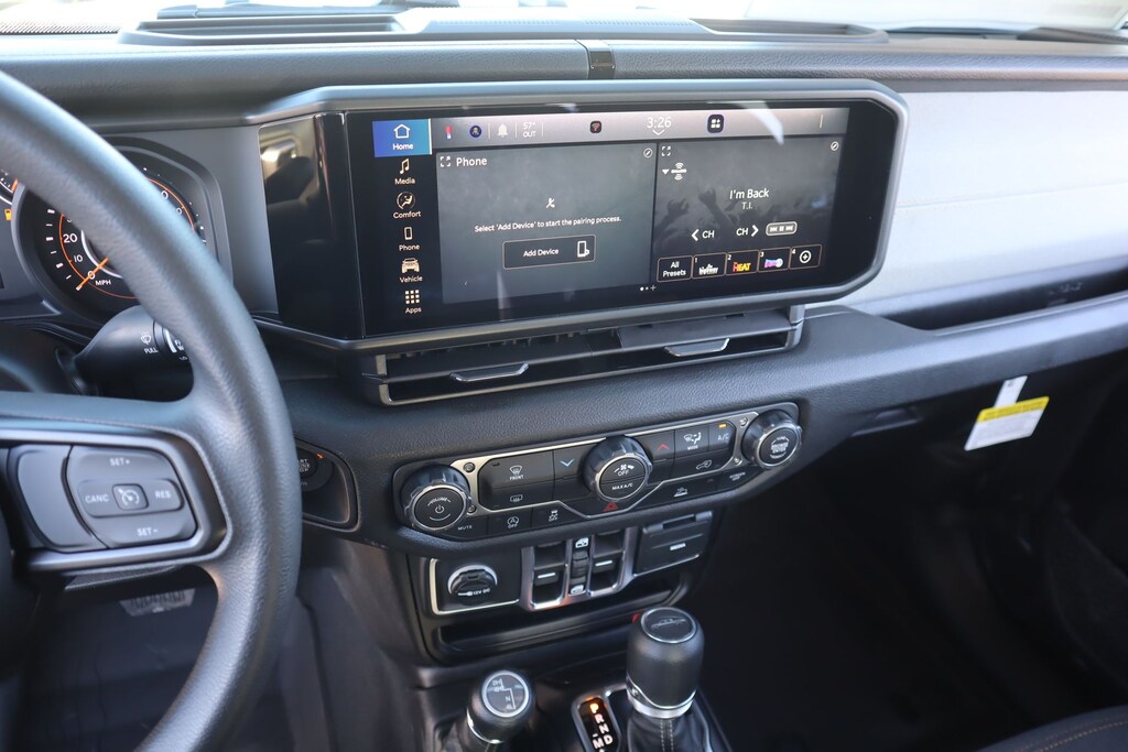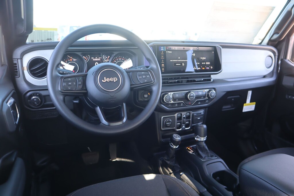 THIS VEHICLE COMES EQUIPPED WITH THE FOLLOWING OPTIONS AND FEATURES: Quick Order Package 24B Sport, 110 Mph Vehicle Max Speed Calibration, 12.3" Touchscreen Display, 3.73 Rear Axle Ratio, 4-Wheel Disc Brakes, 4G LTE Wi-Fi Hot Spot, 8 Speakers, ABS brakes, Air Conditioning, Alexa Built-in, AM/FM radio: SiriusXM with 360L, Apple CarPlay, Apple CarPlay/Android Auto, Black 3-Piece Hard Top, Brake assist, Compass, Connectivity - US/Canada, Delay-off headlights, Driver door bin, Driver vanity mirror, Dual front impact airbags, Dual front side impact airbags, Electronic Stability Control, For Details, Visit DriveUconnect.com, Freedom Panel Storage Bag, Front anti-roll bar, Front Bucket Seats, Front Center Armrest w/Storage, Front fog lights, Front reading lights, Google Android Auto, Illuminated entry, Integrated Center Stack Radio, Integrated roll-over protection, Low tire pressure warning, MOPAR All-Weather Slush Mats, Normal Duty Suspension, Occupant sensing airbag, Outside temperature display, Overhead airbag, Panic alarm, ParkView Rear Back-Up Camera, Passenger door bin, Passenger vanity mirror, Power steering, Power windows, Radio data system, Radio: Uconnect 5 with 12.3" Display, Rear anti-roll bar, Rear reading lights, Rear Sliding Window, Rear Window Defroster, Remote keyless entry, SiriusXM Radio Service, SiriusXM with 360L, Speed control, Split folding rear seat, Steering wheel mounted audio controls, Tachometer, Telescoping steering wheel, Tilt steering wheel, Traction control, Trip computer, USB Host Flip, Variably intermittent wipers, Voltmeter, Wheels: 17" x 7.5" Black Steel Styled, and Wheels: 17" x 7.5" GraY. Price includes: $1000 - 2026 National Retail Bonus Cash . Exp. 03/31/2026