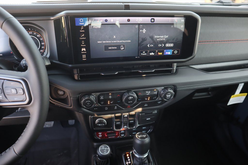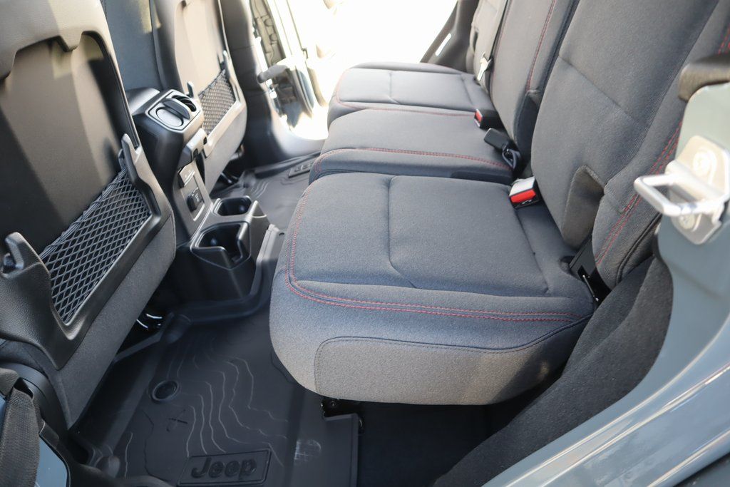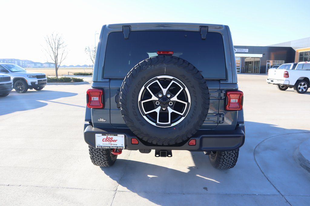 THIS VEHICLE COMES EQUIPPED WITH THE FOLLOWING OPTIONS AND FEATURES: Convenience Group (Heated Front Seats, Heated Steering Wheel, and Universal Garage Door Opener), Quick Order Package 24R Rubicon, Steel Performance Hood Package (Performance Hood), 12.3" Touchscreen Display, 4-Wheel Disc Brakes, 4.10 Rear Axle Ratio, 4G LTE Wi-Fi Hot Spot, 8 Speakers, ABS brakes, Air Conditioning, Alloy wheels, AM/FM radio: SiriusXM with 360L, Apple CarPlay, Apple CarPlay/Android Auto, Automatic temperature control, Aux Battery, Auxiliary Switches, Body Color Rubicon Highline Flare, Brake assist, Class II Receiver Hitch, Cloth Low-Back Bucket Seats, Compass, Connectivity - US/Canada, Delay-off headlights, Driver door bin, Driver vanity mirror, Dual front impact airbags, Dual front side impact airbags, Electronic Stability Control, Emergency communication system: Jeep Connect, For More Info, Call 800-643-2112, Front anti-roll bar, Front Bucket Seats, Front Center Armrest w/Storage, Front dual zone A/C, Front fog lights, Front License Plate Bracket, Front reading lights, Fully automatic headlights, Google Android Auto, Heated door mirrors, Illuminated entry, Integrated Center Stack Radio, Integrated roll-over protection, Low tire pressure warning, MOPAR All-Weather Floor Mats, Non-Lock Fuel Cap Without Discriminator, Occupant sensing airbag, Outside temperature display, Overhead airbag, Panic alarm, ParkView Rear Back-Up Camera, Passenger door bin, Passenger vanity mirror, Performance Suspension, Power door mirrors, Power steering, Power Top Quarter Window Storage Bag, Power windows, Radio data system, Radio: Uconnect 5 with 12.3" Display, Rear anti-roll bar, Rear reading lights, Rear Window Defroster, Rear Window Wiper/Washer, Remot Price includes: $1000 - 2026 National Retail Bonus Cash . Exp. 04/3