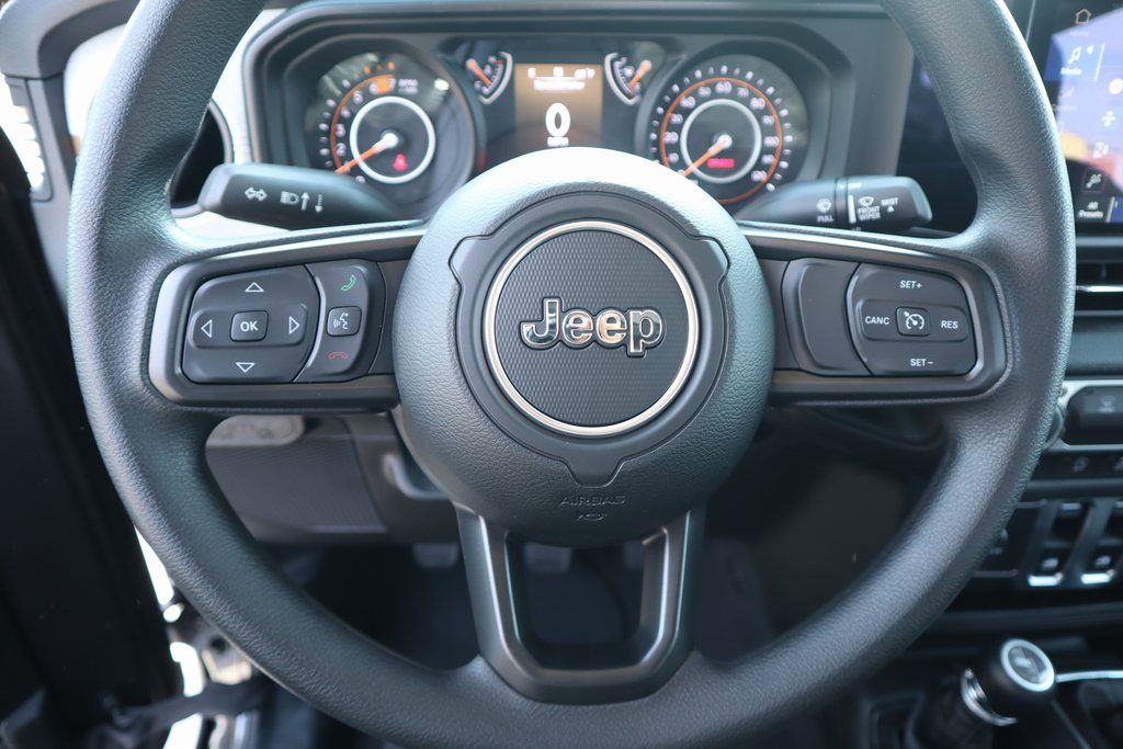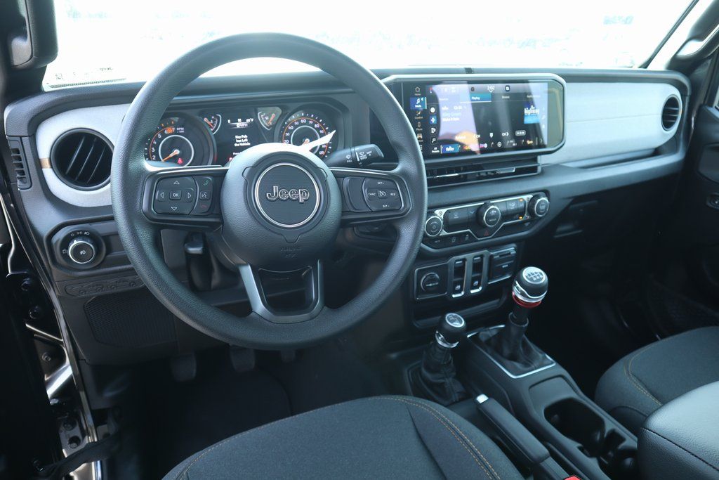 2026 Jeep Wrangler Quick Order Package 23B Sport, 12.3" Touchscreen Display, 3.45 Overall Top Gear Ratio, 4-Wheel Disc Brakes, 4G LTE Wi-Fi Hot Spot, 8 Speakers, ABS brakes, Air Conditioning, AM/FM radio: SiriusXM with 360L, Apple CarPlay, Apple CarPlay/Android Auto, Aux Battery, Brake assist, Cloth Low-Back Bucket Seats, Compass, Connectivity - US/Canada, Delay-off headlights, Driver door bin, Driver vanity mirror, Dual front impact airbags, Dual front side impact airbags, Electronic Stability Control, For More Info, Call 800-643-2112, Front anti-roll bar, Front Bucket Seats, Front Center Armrest w/Storage, Front fog lights, Front reading lights, Google Android Auto, Illuminated entry, Integrated Center Stack Radio, Integrated roll-over protection, Low tire pressure warning, Non-Lock Fuel Cap Without Discriminator, Normal Duty Suspension, Occupant sensing airbag, Outside temperature display, Overhead airbag, Panic alarm, ParkView Rear Back-Up Camera, Passenger door bin, Passenger vanity mirror, Power steering, Power windows, Radio data system, Radio: Uconnect 5 with 12.3" Display, Rear anti-roll bar, Rear reading lights, Remote keyless entry, SiriusXM Radio Service, SiriusXM with 360L, Speed control, Steering wheel mounted audio controls, Stop-Start Dual Battery System, Tachometer, Telescoping steering wheel, Tilt steering wheel, Traction control, Trip computer, Variably intermittent wipers, and Wheels: 17" x 7.5" Black Steel Styled.