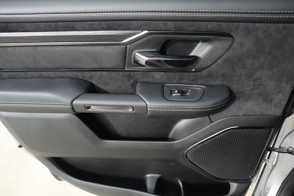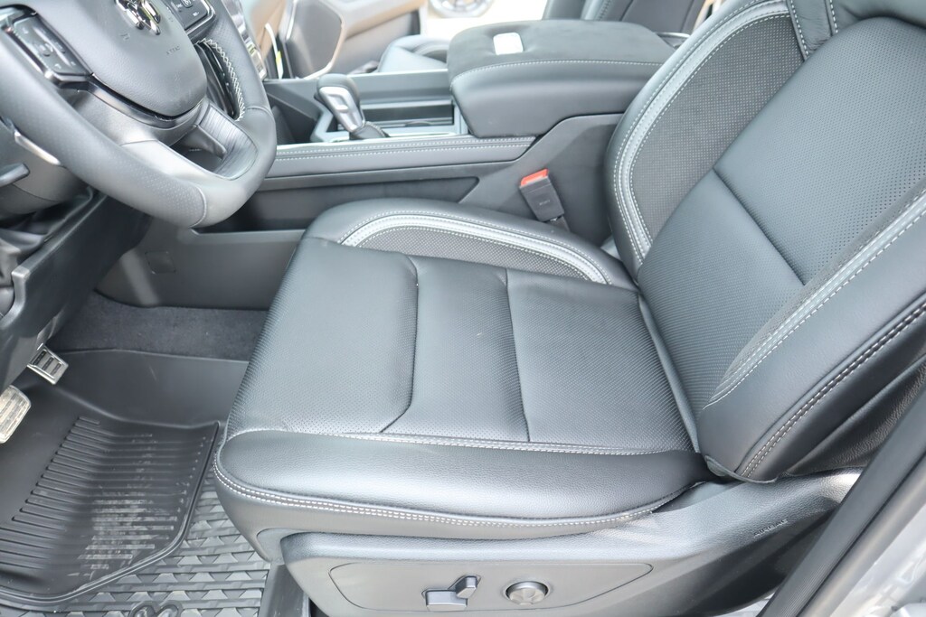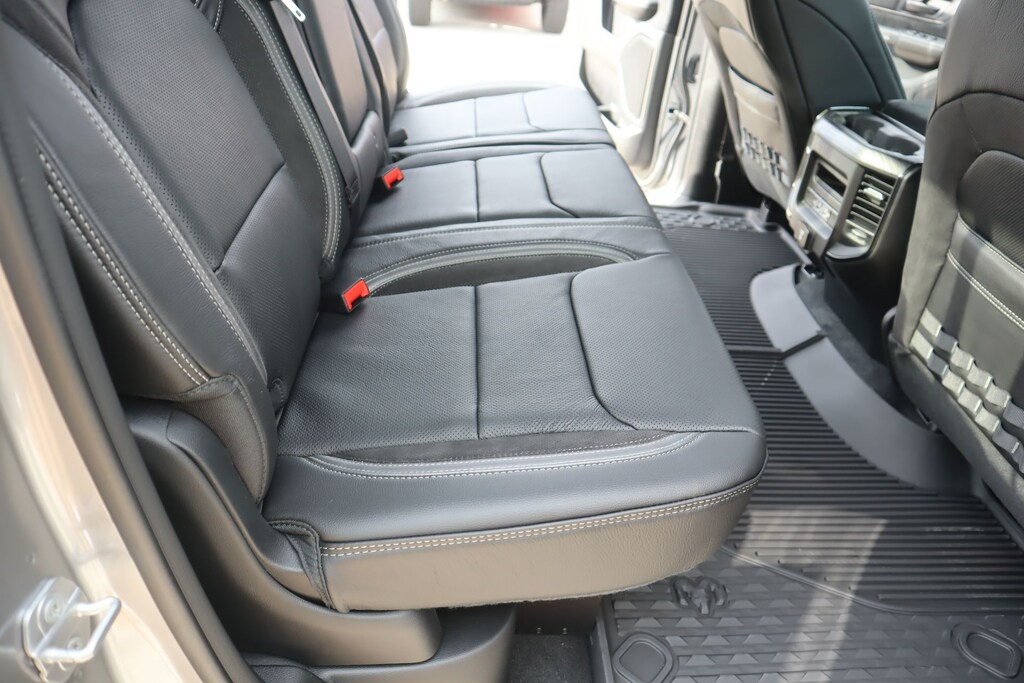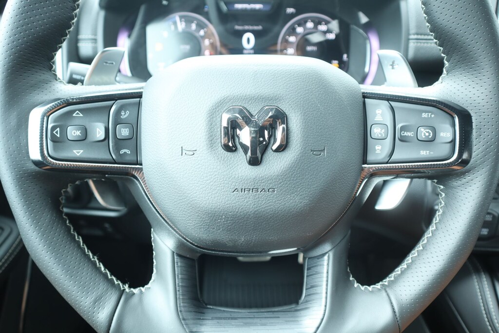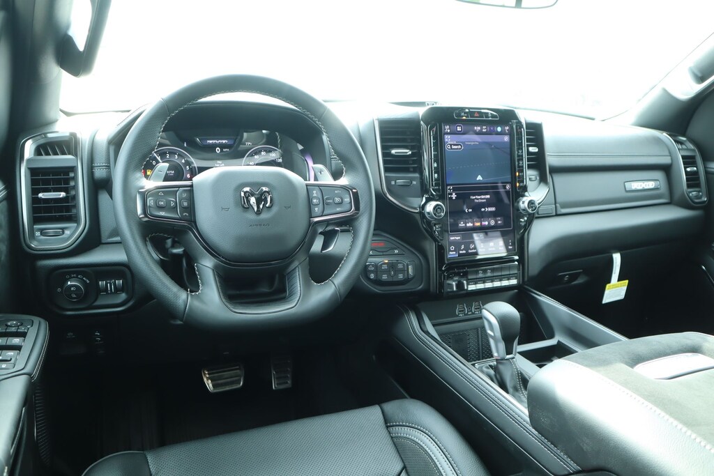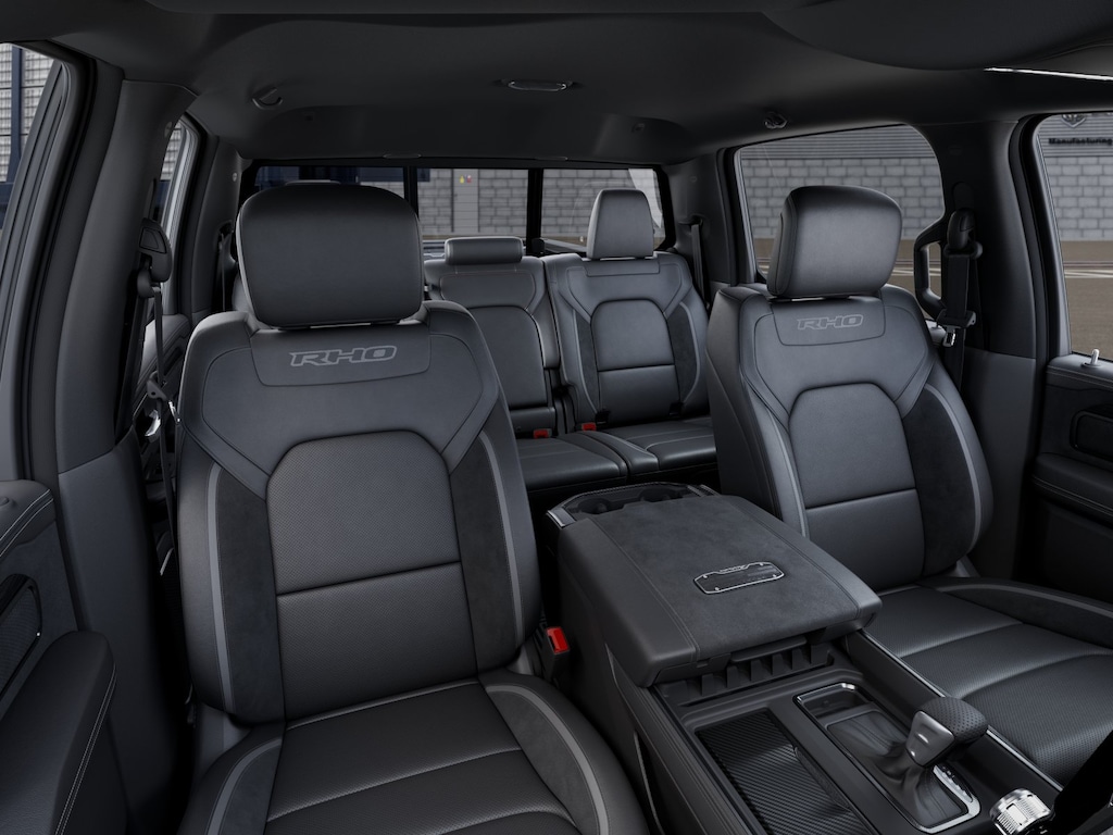 2026 Ram 1500 Bed Utility Group (Exterior 115V AC Outlet, MOPAR 4 Adjustable Cargo Tie-Down Hooks, and MOPAR Deployable Bed Step), Quick Order Package 22Y RHO, 10 Speakers, 3.92 Rear Axle Ratio, 4-Wheel Disc Brakes, 4G LTE Wi-Fi Hot Spot, ABS brakes, Adaptive suspension, Adjustable pedals, Air Conditioning, Alloy wheels, AM/FM radio, Apple CarPlay/Android Auto, Auto High-beam Headlights, Auto Power-Folding Mirrors, Auto-dimming door mirrors, Auto-Dimming Exterior Driver Mirror, Auto-dimming Rear-View mirror, Automatic temperature control, Brake assist, Compass, Connected Travel and Traffic Services, Connectivity - US/Canada, Delay-off headlights, Disassociated Touchscreen Display, Driver door bin, Driver vanity mirror, Dual front impact airbags, Dual front side impact airbags, Electronic Stability Control, Exterior Mirrors Courtesy Lamps, Exterior Mirrors with Heating Element, Exterior Mirrors with Supplemental Signals, Exterior Parking Camera Rear, Flareside Box, Front anti-roll bar, Front Bucket Seats, Front Center Armrest w/Storage, Front dual zone A/C, Front fog lights, Front reading lights, Front wheel independent suspension, Fully automatic headlights, Garage door transmitter, GPS Navigation, HD Radio, Heated door mirrors, Heated front seats, Heated steering wheel, Illuminated entry, Integrated Center Stack Radio, Integrated Voice Command with Bluetooth, Leather Shift Knob, Leather steering wheel, Leather Trimmed Bucket Seats, Low tire pressure warning, Navigation System, Occupant sensing airbag, Outside temperature display, Overhead airbag, Overhead console, Panic alarm, Passenger door bin, Passenger vanity mirror, Power door mirrors, Power driver seat, Power passenger seat, Power steering, Power windows, Radio data system, Radio: Uconnect 5 Navigation with 12.0" Display, Rear reading lights, Rear seat center armrest, Rear step bumper, Rear window defroster, Remote keyless entry, Security system, SiriusXM Radio Service, Speed control, Split folding rear seat, Sport steering wheel, Steering wheel mounted audio controls, Tachometer, Telescoping steering wheel, Tilt steering wheel, Traction control, Trip computer, Turn signal indicator mirrors, USB Host Flip, Variably intermittent wipers, Voltmeter, and Wheels: 18" x 9" Black Paint/Polish Aluminum.