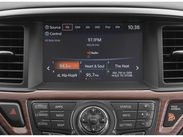 - Radio: Bose Premium Audio w/AM/FM/CD & 13 Speakers -inc: 8" color display w/multi-touch control, voice recognition for audio, Bluetooth® and vehicle information, including music search by voice, HD Radio, SiriusXM satellite radio, USB connection ports (2) for iPod interface and other compatible devices, SiriusXM Travel Link (weather, fuel prices, movie listings, stock info and sports), Bluetooth® hands-free phone system, streaming audio via Bluetooth®, hands-free text messaging assistant and RCA AUX input (inside center console), NissanConnect w/Navigation and services includes voice recognition for navigation, one-shot voice destination entry, SiriusXM Traffic and digital clock, NissanConnect Services powered by SiriusXM includes automatic collision notification; emergency call and stolen vehicle locator; remote services including start/stop, lock/unlock, flash lights, sound horn; customizable alerts including drive zone, valet, curfew and speed alerts; dealer service scheduling and maintenance alerts, Radio Data System (RDS), MP3/WMA CD playback and Speed Sensitive Volume control (SSV)