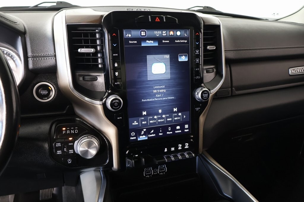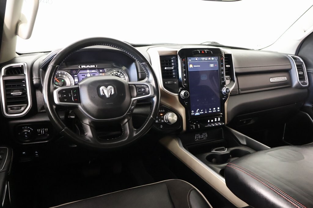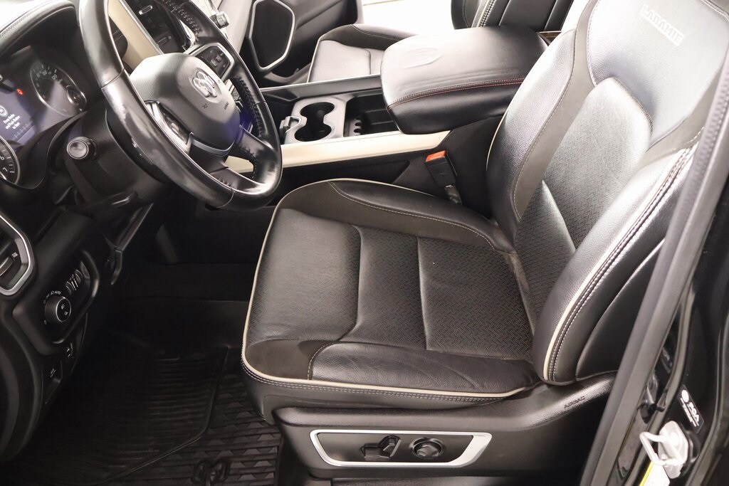 2022 Ram 1500 Laramie Level An Equipment Group (DISC) (Auto High Beam Headlamp Control, Foam Bottle Insert (Door Trim Panel), ParkSense Front/Rear Park Assist w/Stop, Rain Sensitive Windshield Wipers, Rear 60/40 Folding Split Recline Seat, and Remote Tailgate Release), Quick Order Package 27H Laramie, #1 Seat Foam Cushion, 10 Speakers, 12" Touchscreen Display, 2nd Row In Floor Storage Bins, 3 Rear Seat Head Restraints, 4 Way Front Headrests, 4-Wheel Disc Brakes, 48V Belt Starter Generator, 4G LTE Wi-Fi Hot Spot, 8.4" Touchscreen Display, ABS brakes, Adjustable pedals, Air Conditioning, All R1 High Radios, All Radio Equipped Vehicles, Alloy wheels, AM/FM radio: SiriusXM, Anti-Spin Differential Rear Axle, Apple CarPlay, Apple CarPlay/Android Auto, Audio memory, Auto-dimming door mirrors, Auto-Dimming Exterior Driver Mirror, Auto-dimming Rear-View mirror, Automatic temperature control, Brake assist, Bumpers: chrome, Chrome Exterior Mirrors, Compass, Connected Travel & Traffic Services, Connectivity - US/Canada, Convex Wide-Angle Mirror Insert, Delay-off headlights, Disassociated Touchscreen Display, Driver door bin, Driver Seat Memory, Driver vanity mirror, Dual front impact airbags, Dual front side impact airbags, Electronic Stability Control, Exterior Mirrors Courtesy Lamps, Exterior Mirrors w/Heating Element, Exterior Mirrors w/Memory, Exterior Mirrors w/Supplemental Signals, For Details, Visit DriveUconnect.com, For More Info, Call 800-643-2112, Front anti-roll bar, Front Center Armrest w/Storage, Front dual zone A/C, Front fog lights, Front reading lights, Front Seat Back Map Pockets, Front wheel independent suspension, Fully automatic headlights, Garage door transmitter, Global Telematics Box Module (TBM), Google Android Auto, GPS Antenna Input, GPS Navigation, HD Radio, Heated door mirrors, Heated Front Seats, Heated front seats, Heated Steering Wheel, Heated steering wheel, Heavy-Duty Engine Cooling, Illuminated entry, Integrated Center Stack Radio, Integrated Voice Command w/Bluetooth, Leather steering wheel, Leather Trim 40/20/40 Bench Seat, Low tire pressure warning, Memory seat, MOPAR Front & Rear Rubber Floor Mats, Occupant sensing airbag, Outside temperature display, Overhead airbag, Overhead console, Panic alarm, ParkView Rear Back-Up Camera, Passenger door bin, Passenger vanity mirror, Pedal memory, Power 2-Way Driver Lumbar Adjust, Power 2-Way Passenger Lumbar Adjust, Power 8-Way Driver & Passenger Seats, Power door mirrors, Power driver seat, Power passenger seat, Power steering, Power windows, Power-Folding Mirrors, Radio data system, Radio: Uconnect 5 Nav w/12.0" Display, Radio: Uconnect 5 W w/8.4" Display, Rear 60/40 Folding Seat, Rear anti-roll bar, Rear seat center armrest, Rear step bumper, Rear Wheelhouse Liners, Rear window defroster, Remote keyless entry, Security system, SiriusXM Radio Service, SiriusXM w/360L, Speed control, Split folding rear seat, Steering wheel mounted audio controls, Tachometer, Telescoping steering wheel, Tilt steering wheel, Traction control, Trailer Brake Control, Trip computer, Turn signal indicator mirrors, USB Host Flip, Variably intermittent wipers, Ventilated Front Seats, Ventilated front seats, Voltmeter, Wheels: 18" x 8" Aluminum Base Painted, and Wheels: 20" x 9" Premium Paint/Polished.